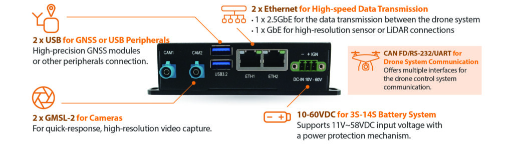 NVIDIA® Jetson Orin™ NX SoM w/ 2 x GMSL / 1 x CAN FD / 1 x UART Lightweight AI Drone Computer